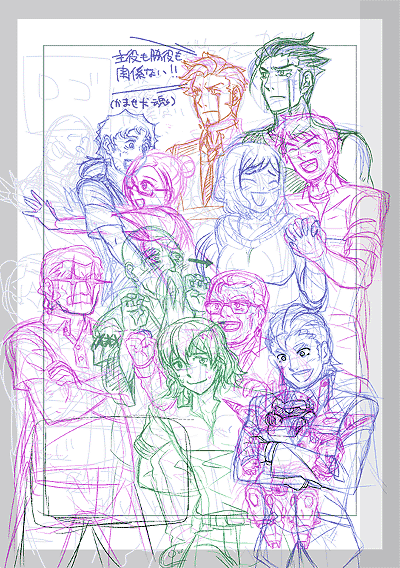 ペーパー1ページ目、構図に面白みがない集合絵です。