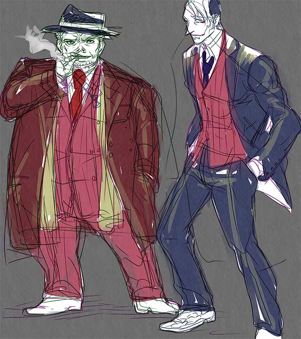 スーツ着たらマフィアっぽくなるんじゃねー!?と思って描いた、クダルちゃんとカバヤン下書き。